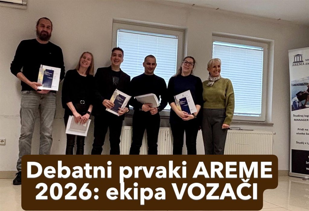 naziv Debatni prvaki AREME 2026. Vsi sodelujoči študenti so prejeli tudi simbolične knjižne nagrade kot priznanje za
